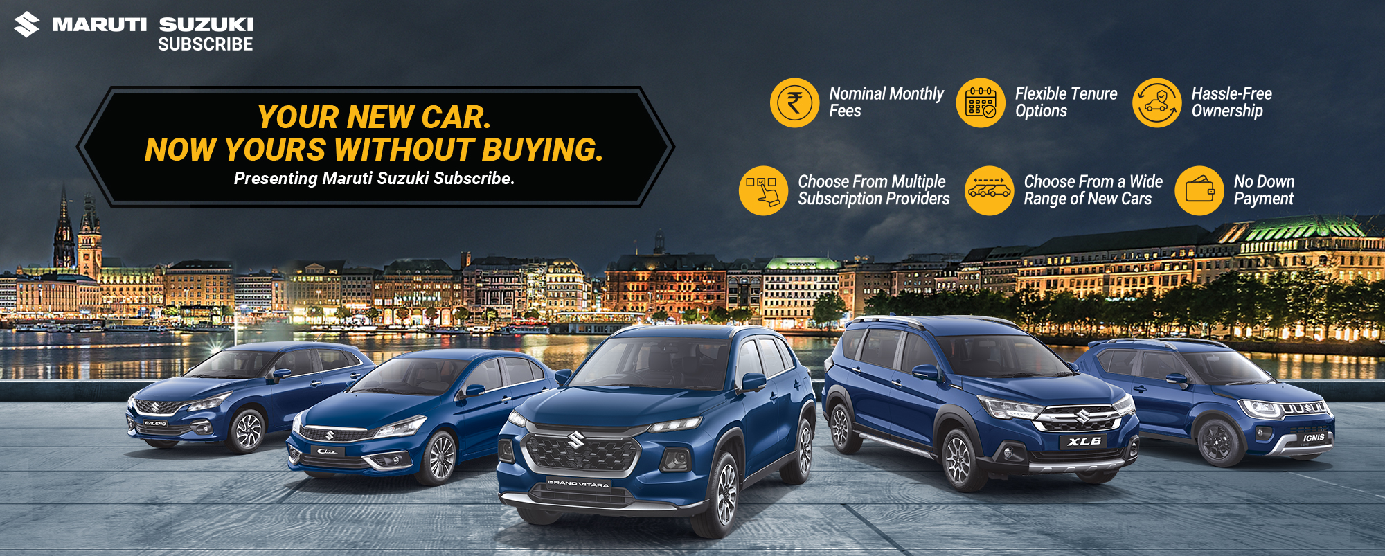 Maruti Suzuki Subscribe enables all customers to enjoy driving their preferred Maruti Suzuki cars without having to deal with all the financial responsibilities that come with owning a car.All you need to do is opt for a monthly subscription plan at a fixed monthly fee, which includes the routine maintenance and insurance costs, and choose a flexible tenure. At Prem Motors in, AG Office Road, Gwalior, all Hatchback, Sedan, SUV, the MUV models line-up includes Baleno, Invicto, EVitara, Jimny, Ciaz, Ignis, Fronx, Grand Vitara, XL6. Here, you will enjoy Maruti Suzuki Subscribe benefits such as: